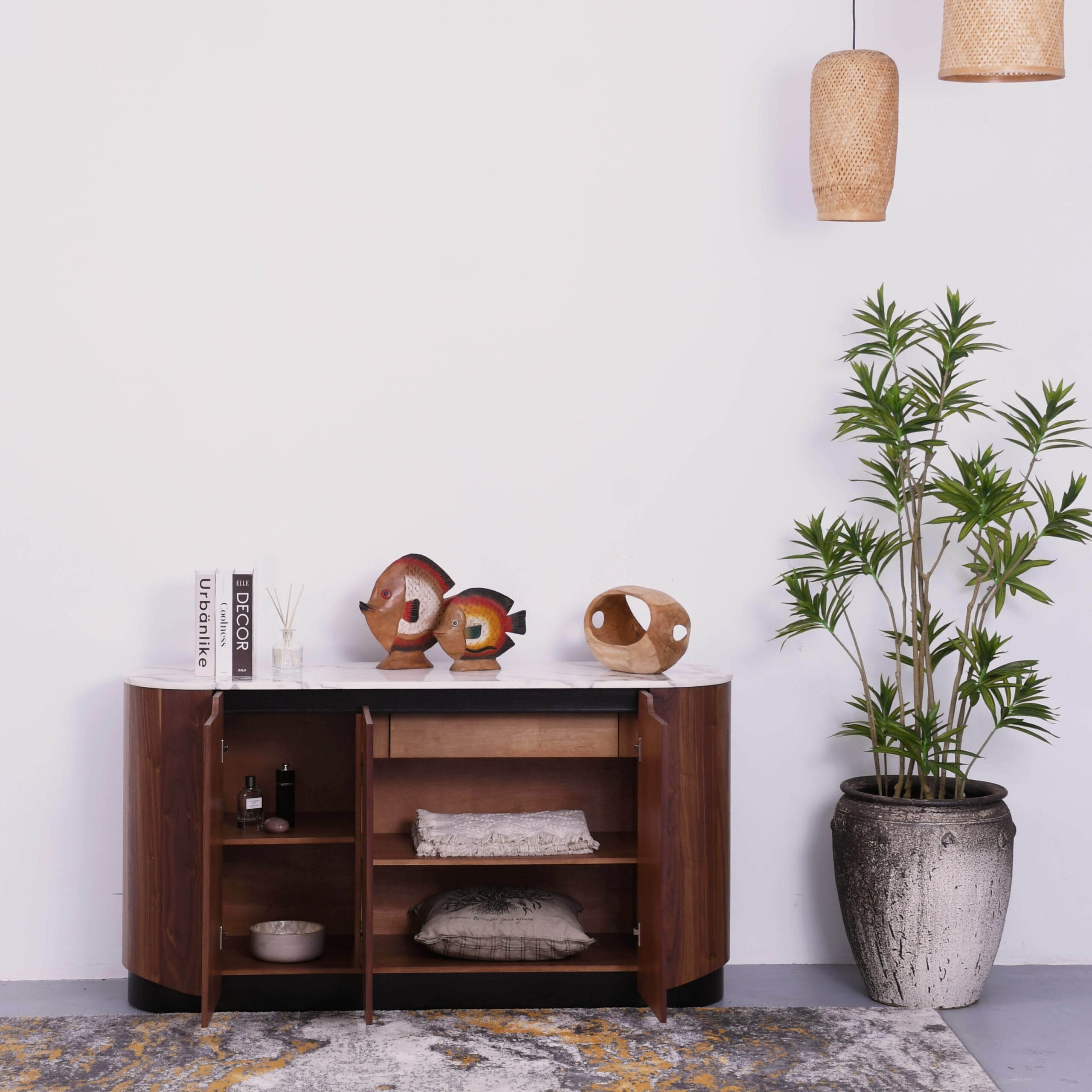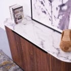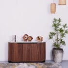 Olax sideboard is crafted from walnut veneer and topped with marble surface, designed in a sleek rounded edges for a modern contemporary look