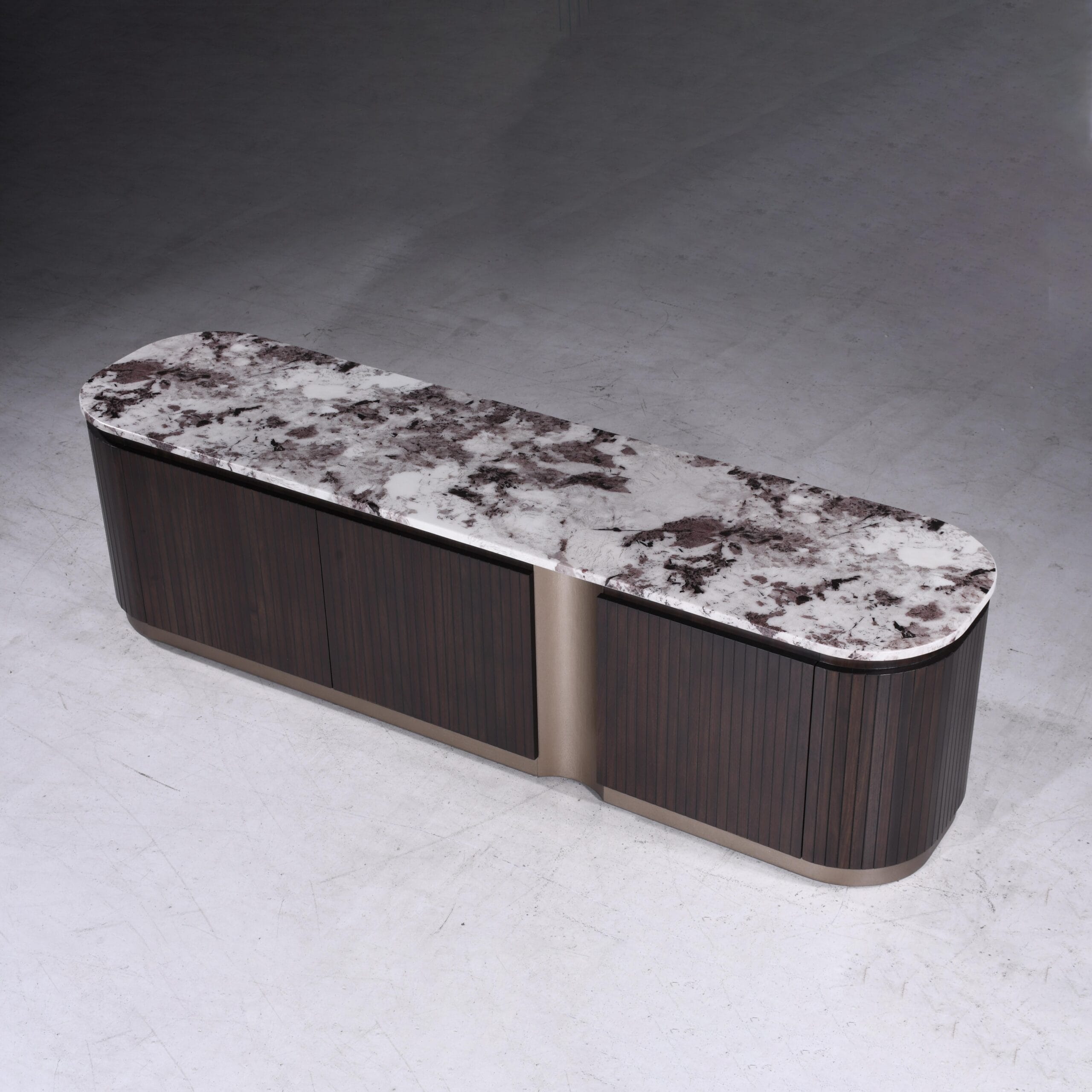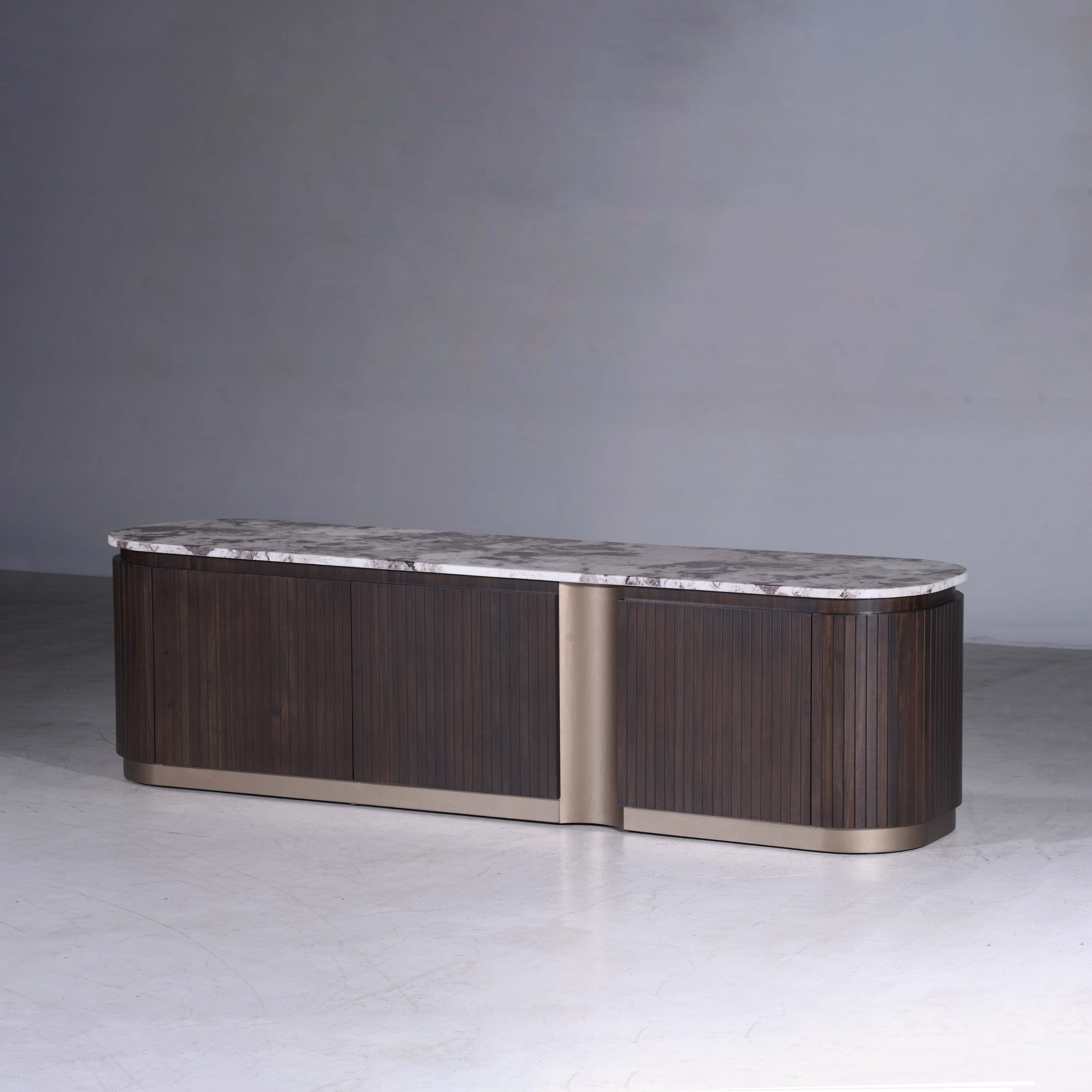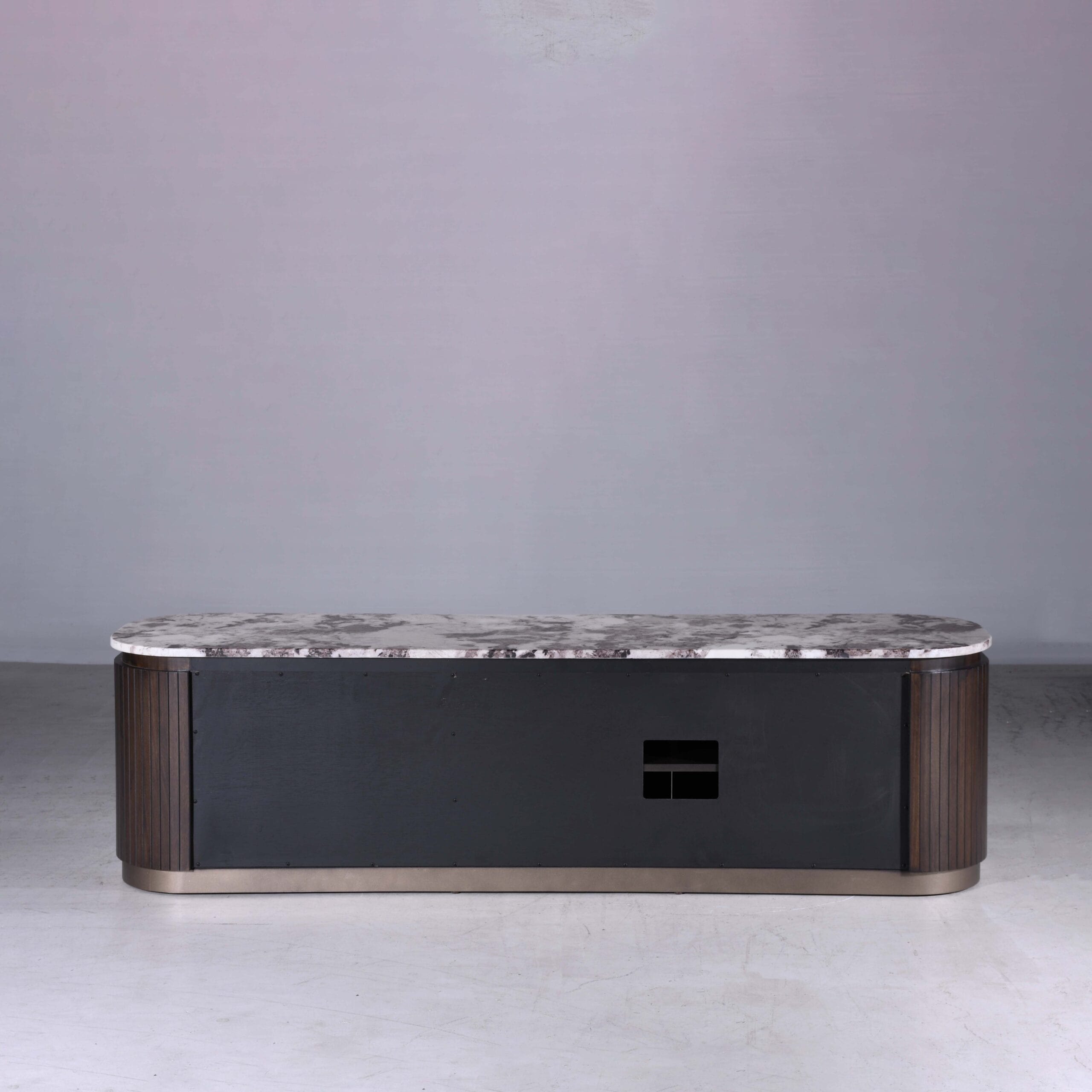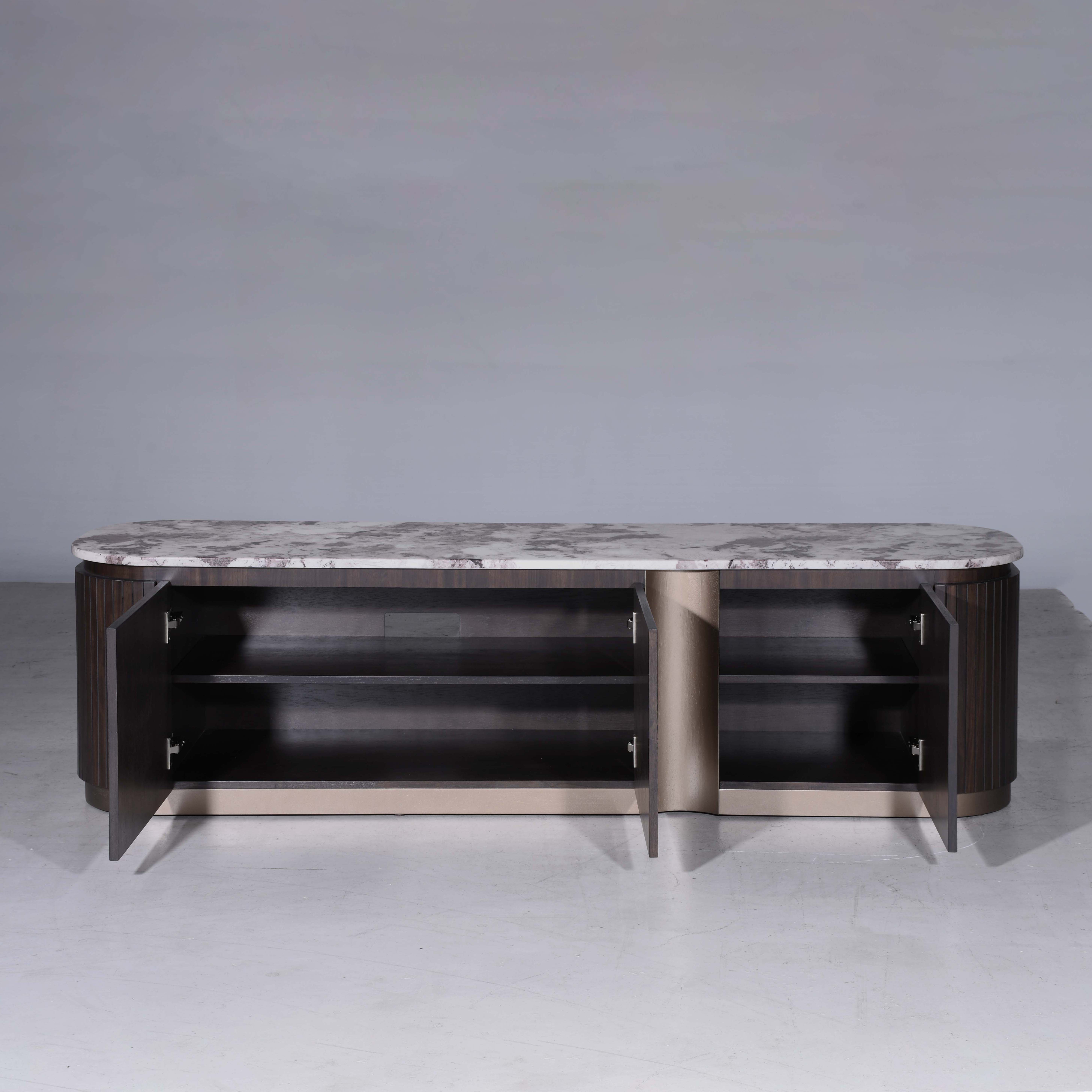 Classy is designed with smooth rounded edges, and vertical panel detailing that form a modern silhouette. Coupled with luxurious marble top and finished in a rich charcoal tone with bronze accents, it exudes timeless elegance and sophistication