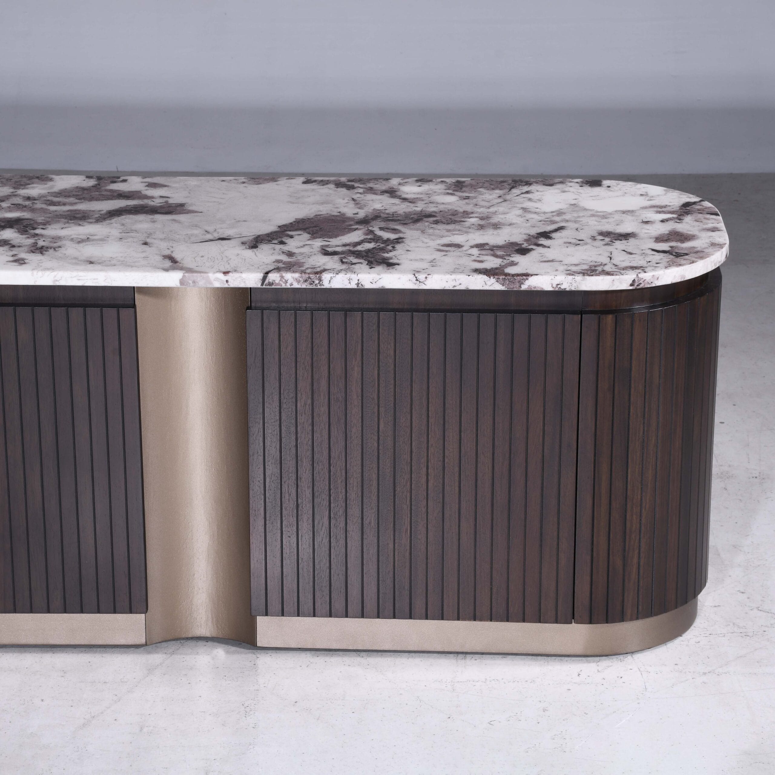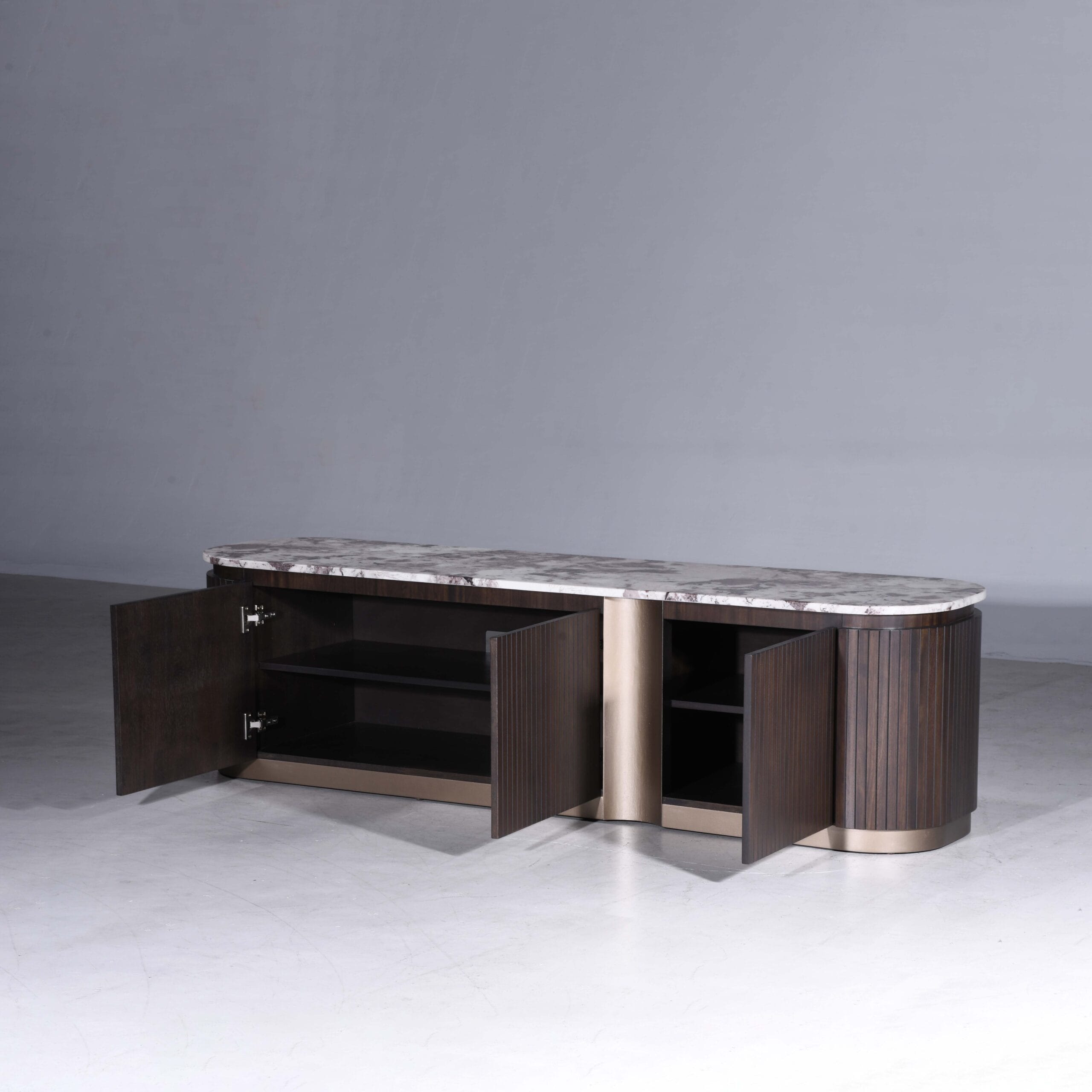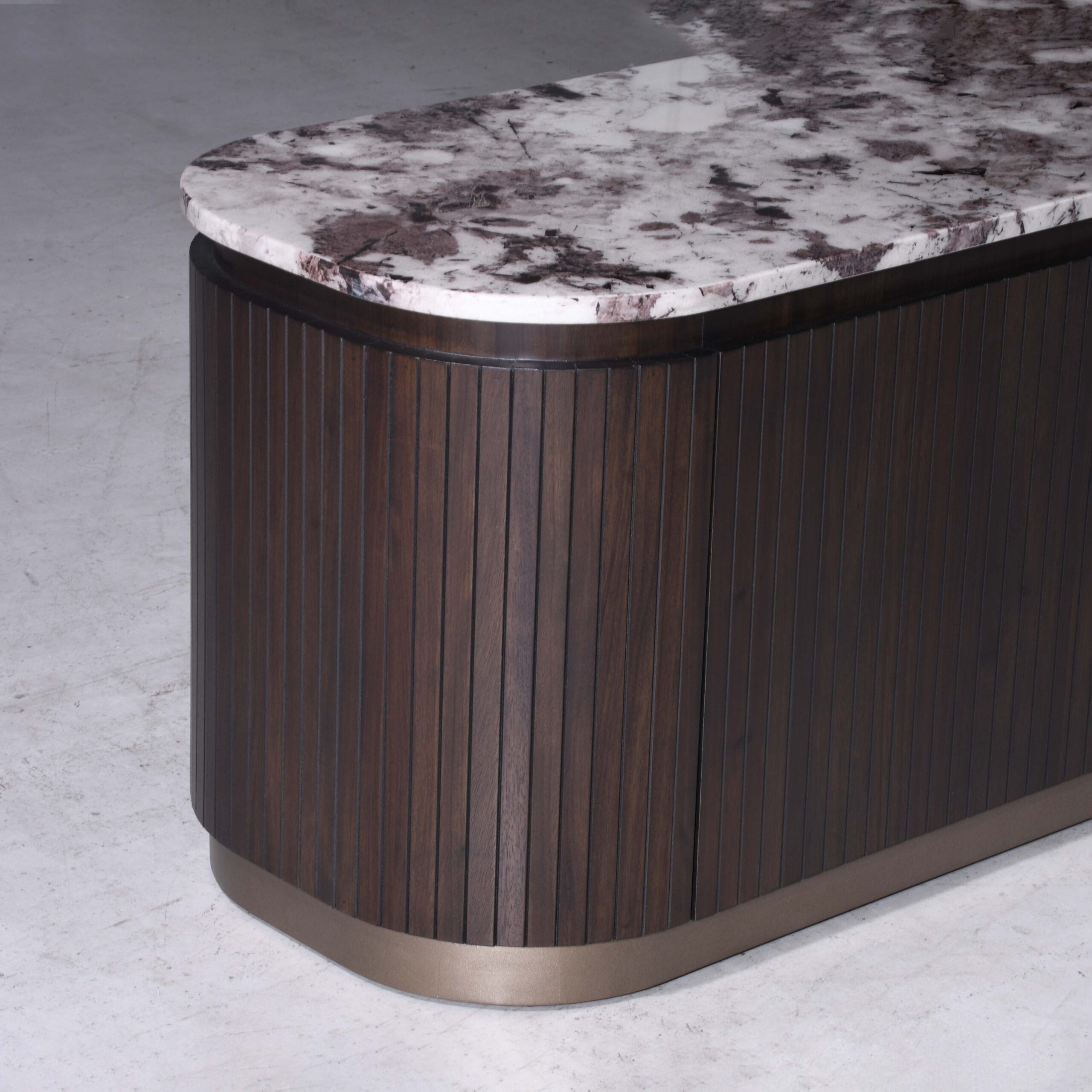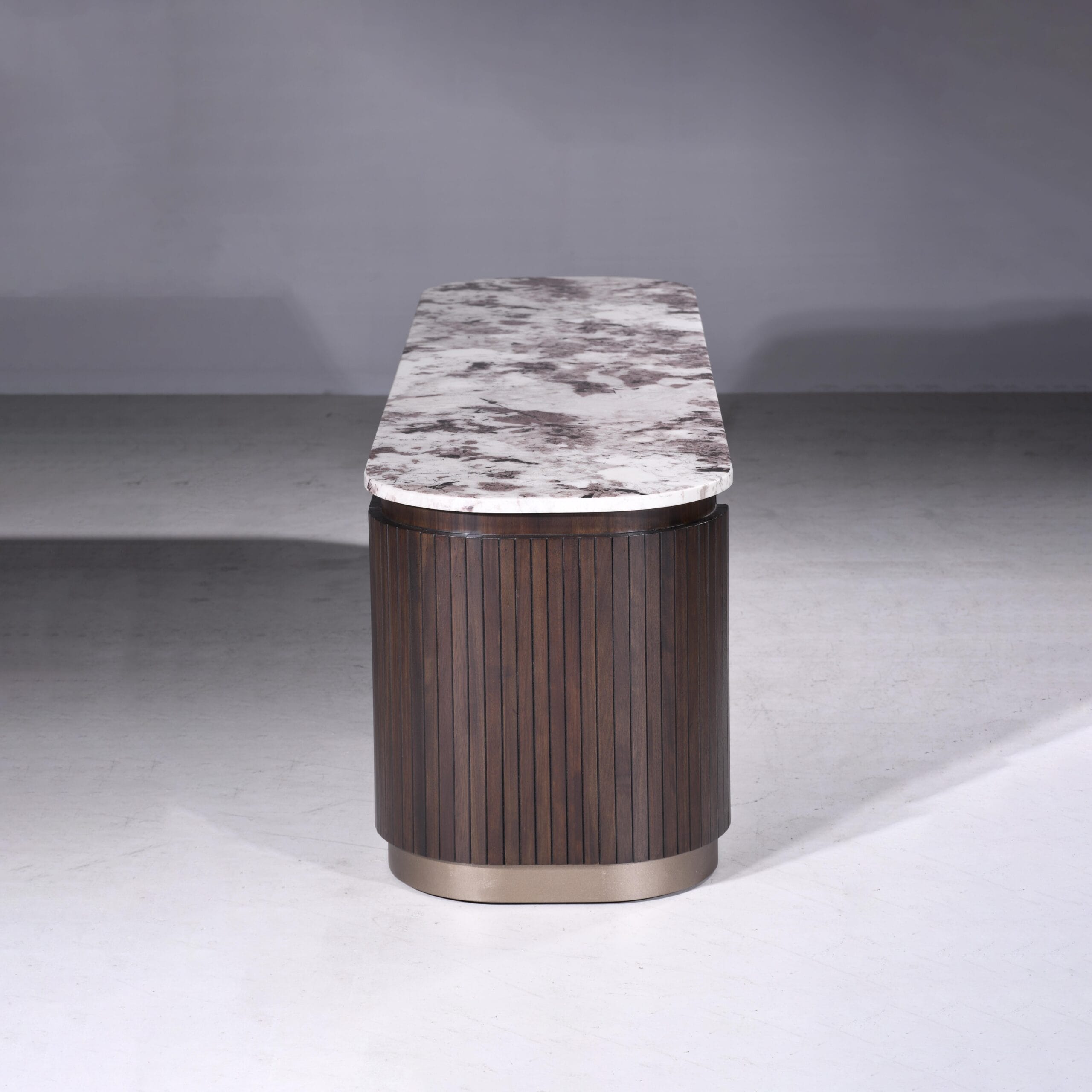 Classy is designed with smooth rounded edges, and vertical panel detailing that form a modern silhouette. Coupled with luxurious marble top and finished in a rich charcoal tone with bronze accents, it exudes timeless elegance and sophistication